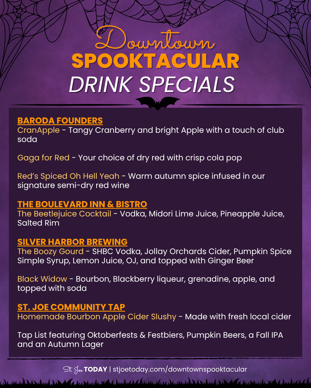 Enjoy Halloween-themed drinks at the participating locations listed above in the downtown Social District during the event! Check out the menu HERE!